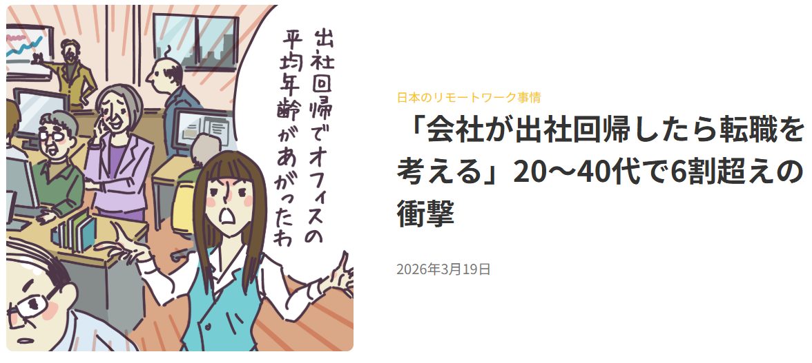 株式会社LASSIC(ラシック)(本社:東京都港区、本店: 鳥取県鳥取市、代表取締役社長: 若山幸司、以下「LASSIC」)が運営する、「場所に依存しない働き方」を推進・支援する情報を発信するWEBメディア「テレワーク・リモートワーク総合研究所(テレリモ総研)」は、出社回帰と転職の関係性について記事を公開しました。