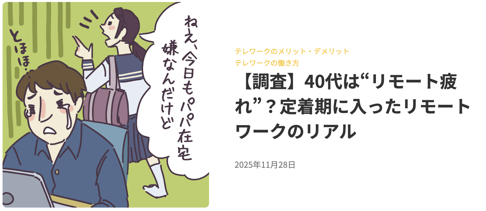 【リモートワーク市場調査】40代は“リモート疲れ”?定着期に入ったリモートワークのリアルが見えてくる。「リモートワークのメリット・デメリット」を大調査
