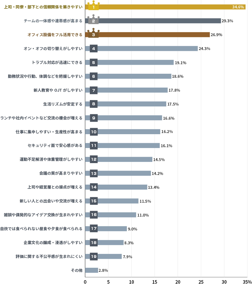 最も多く挙げられたのは「信頼関係を築きやすい」(34.6%)でした。次いで「チームの一体感や連帯感が高まる」(29.3%)、「オフィス設備をフル活用できる」(26.9%)、「オン・オフの切り替えがしやすい」(24.3%)と続きます。