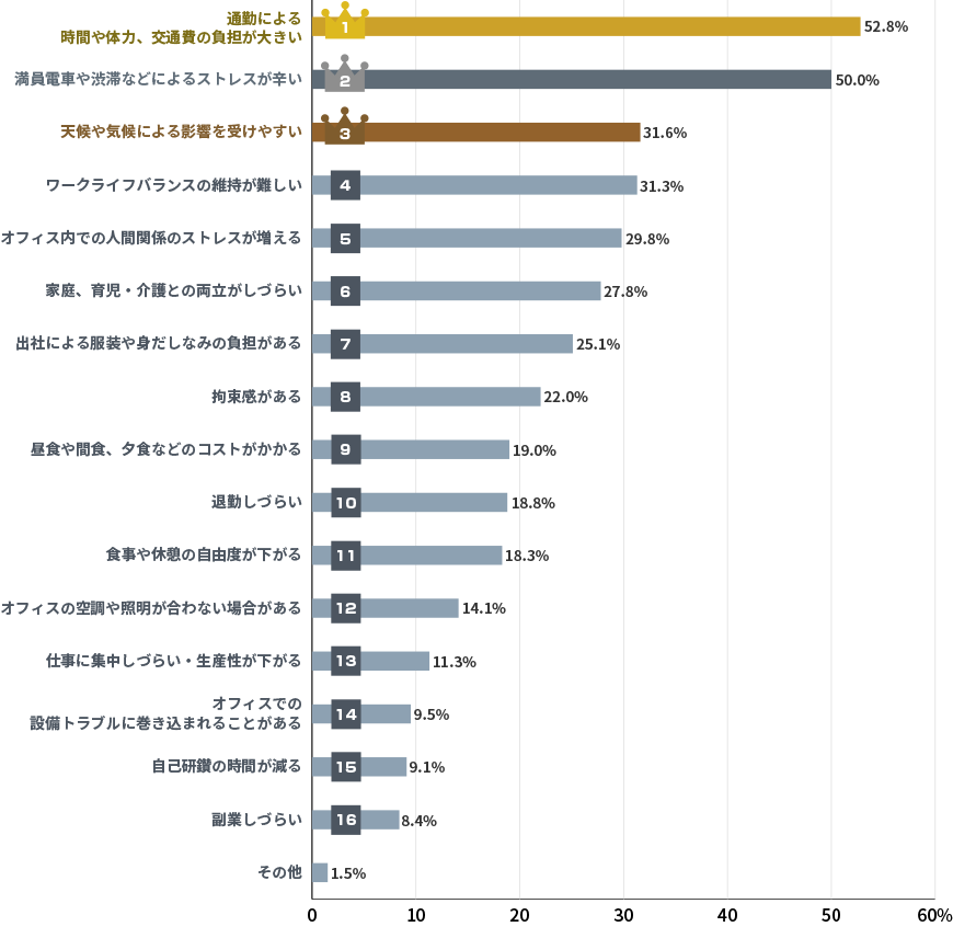 デメリットでは、1位と2位がいずれも5割超で突出しました。「通勤による時間や体力、交通費の負担」(52.8%)と「満員電車や渋滞によるストレス」(50.0%)です。フル出社勤務で感じる最大のデメリットは、通勤にあることが明確です。