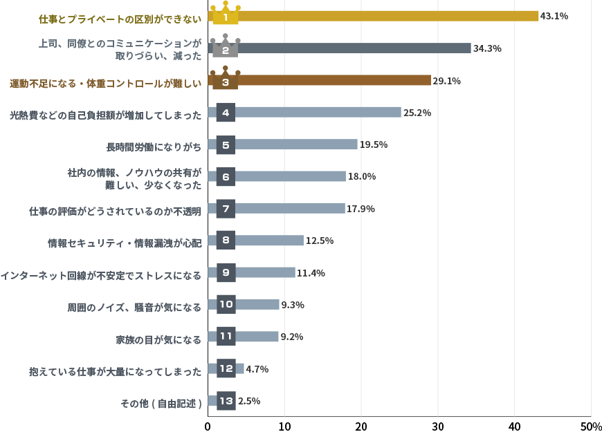 リモートワーク期間が長くなるにつれ、問題が蓄積してきたことが、順位の変化に影響しているのでしょうか。