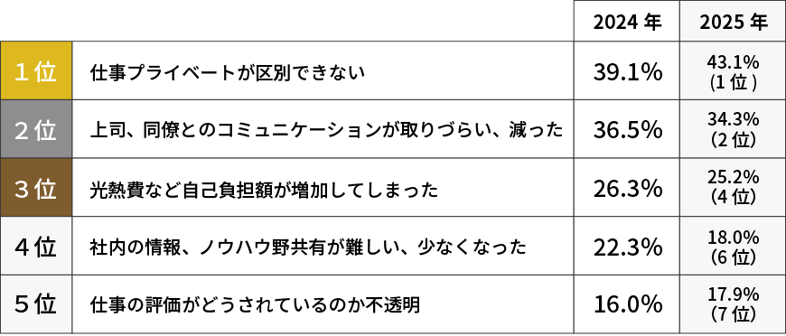 1位は同じ「仕事とプライベートの区別ができない」ですが、割合は39.1%から43.1%へと4ポイント増加しました。