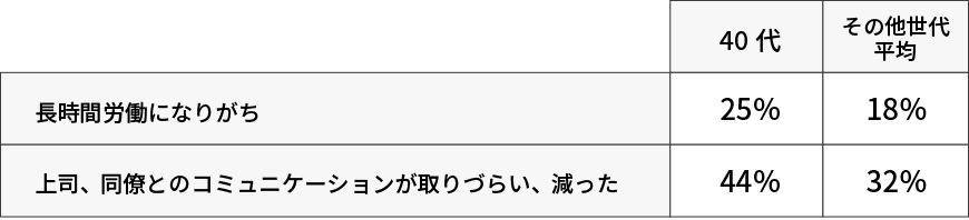 たとえば「長時間労働になりがち」と回答したのは40代が25%であるのに対し、その他の世代平均では18%と、7ポイントの開きがありました。