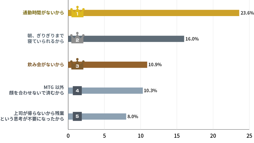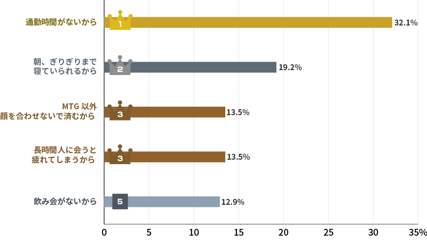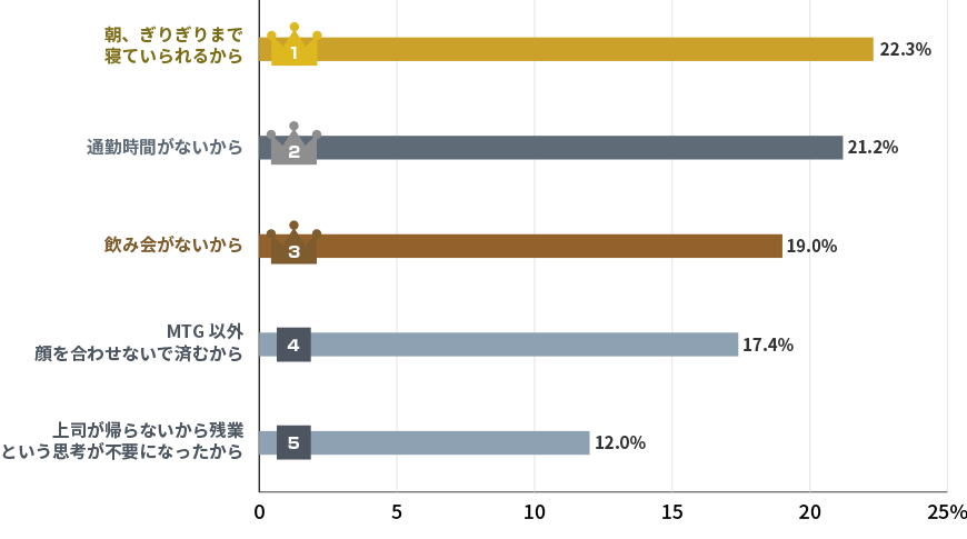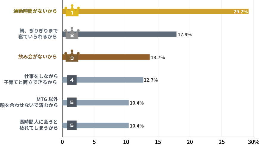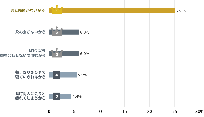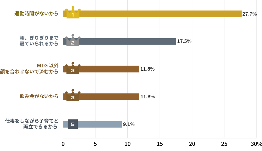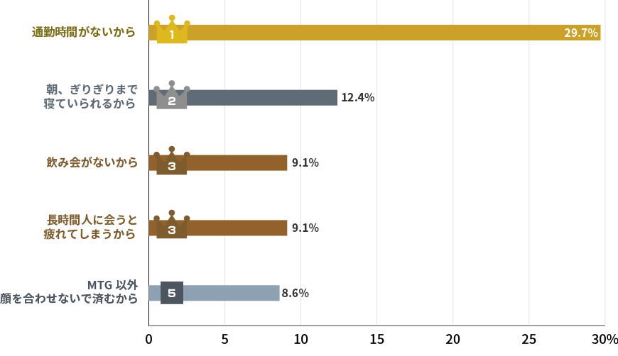 加えて、「飲み会がない」「MTG以外顔を合わせなくて済む」といった、対面コミュニケーションに関する理由も上位に入りました。